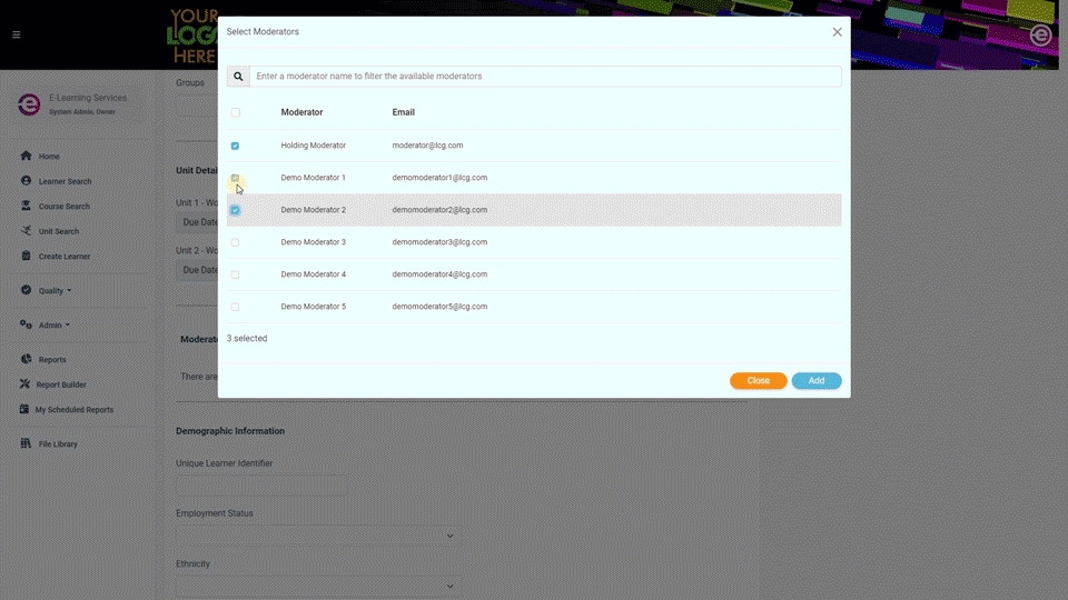 3. Locate the Learner(s) account using the Filter Options on Course Search